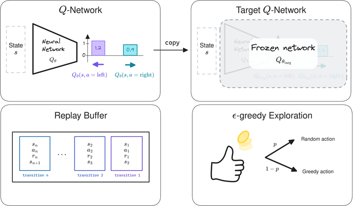 The key components of DQN ($Q$-network, target network, replay buffer) are at the core of Deep RL algorithms for continuous control used on real robots, such as Soft Actor-Critic (SAC). I will introduce these algorithms in a future blog post.